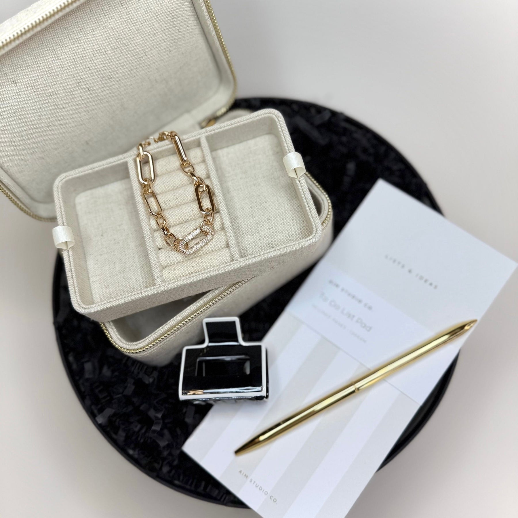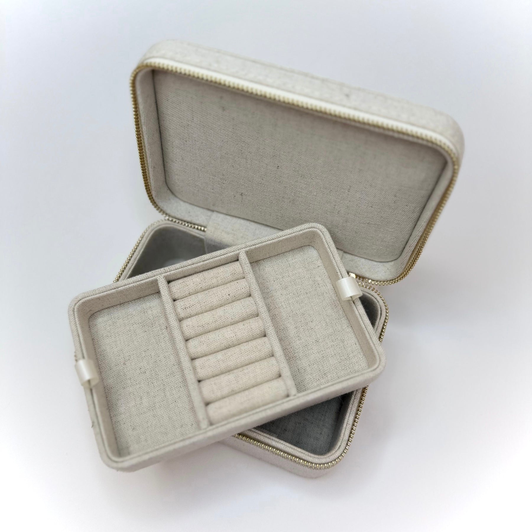 Inside this case, you'll find a top layer of ring rolls and small sections for smaller jewellery, which can be lifted up to reveal a large open section underneath for bigger pieces! This case is lined in linen and cotton in a beige shade for a natural themed piece you'll love.